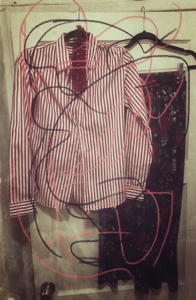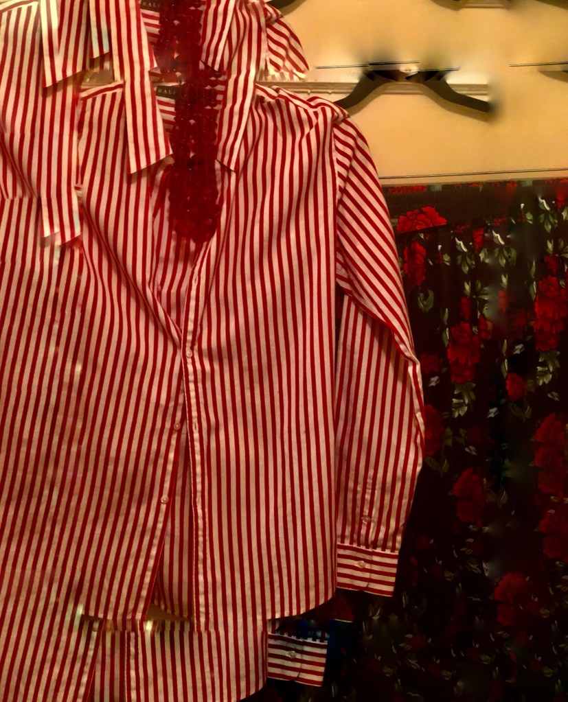 Red and white striped button-down shirt + black floral pantsHomage to Stella JeanHomage to Stella Jean