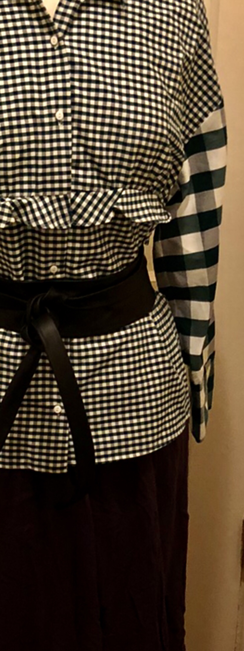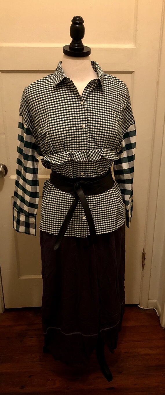 Comprised of full raffles and checks the silhouette of this green and white gingham blouse becomes more sophisticated with the addition of a black leather wraparound belt. Comfort, as always, is a consideration for a work outfit, so the pairing with the lightweight black pants makes sense especially when they’re further brought down to earth with a lightweight jacket and snazzy pair of sneakers