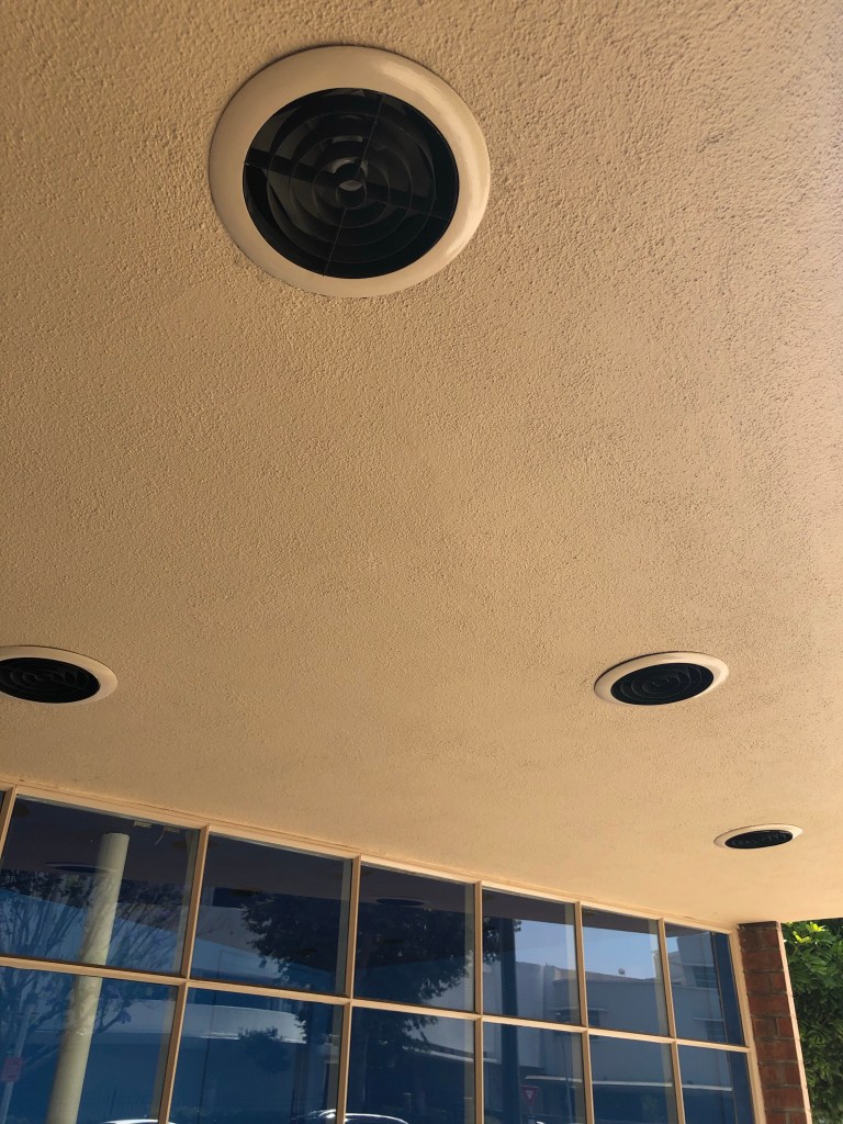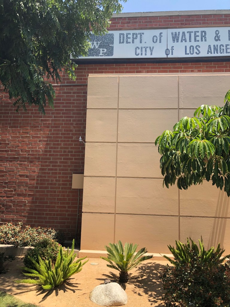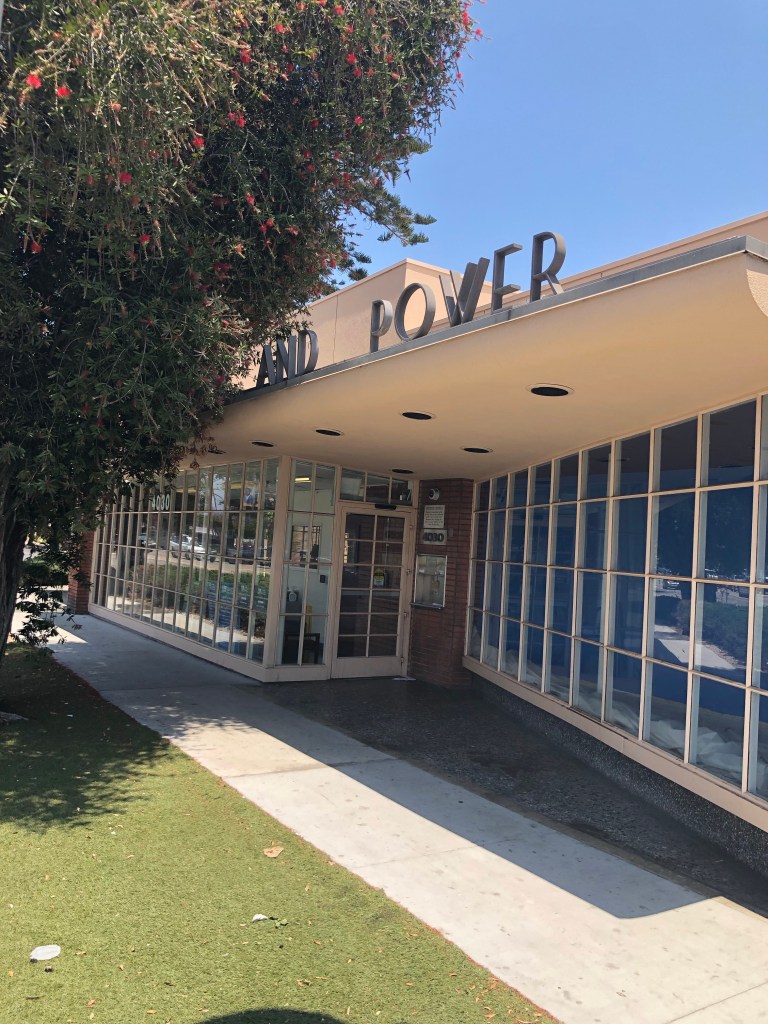 On the Saturday I visited and photographed the Department of Water and Power building at 4030 Crenshaw Blvd. I wouldn’t have noticed it if I hadn’t stopped to videotape a Juneteenth Day parade in front of the Baldwin Hills Crenshaw Plaza with my iPhone. Out of the corner of my left eye I saw it, and was so excited I started photographing it immediately from across the street.