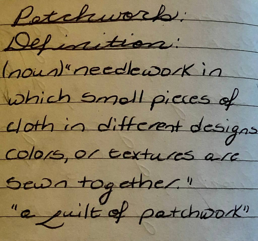Patchwork (Definition): (noun) needlework in which small pieces of cloth in different designs, colors, or textures are sewn together. “a quilt of patchwork”.